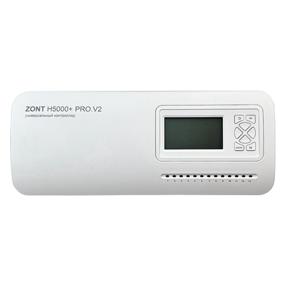 Универсальный контроллер ZONT H5000+ PRO.V2 - представляет собой устройство, обладающее возможностями гибкого программирования для решения задач автоматизации и подходит для дистанционного контроля и управления сложными инженерными системами.Контроллер ZONT H5000+ PRO.V2 может управлять несколькими котлами (до 20-ти) релейно или по цифровой шине. Под крышку прибора устанавливаются 2 платы цифровых шин, если требуется управление большим количеством котлов по цифровой шине, то используются внешние адаптеры. Прибор обладает 12 релейными выходами, 6 универсальными входами/выходами, 2 аналоговыми выходами 0-10В, 2 токовыми входами 4-20 мА, 12 входами NTC и поддерживает работу с 5-ю блоками расширения ZONT любого номинала.