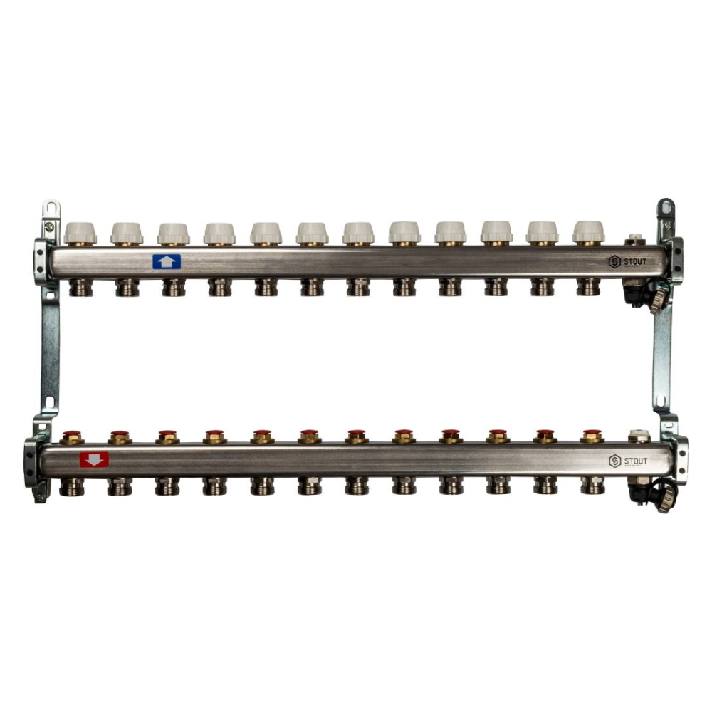 Коллектор из нерж. стали 12 выходов без расходомеров, с клапаном вып. воздуха и сливом / Stout