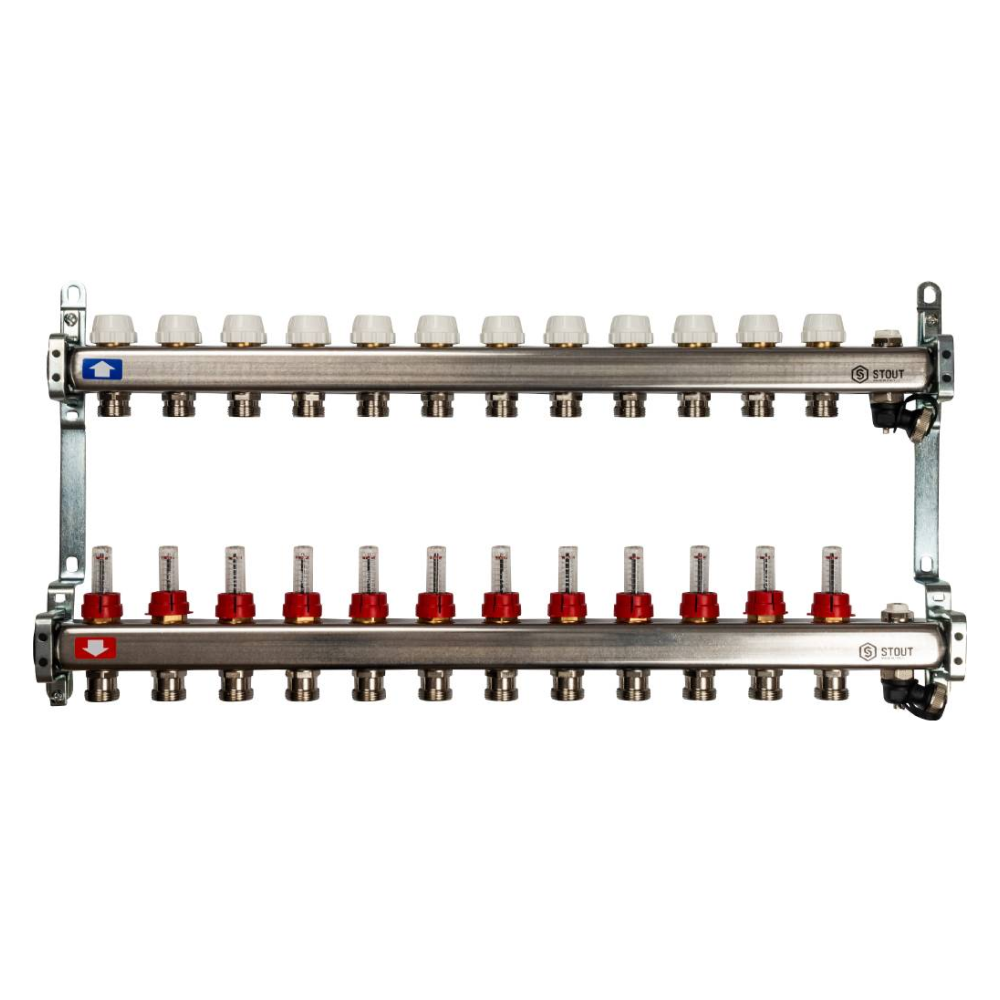 Коллектор из нерж. стали 12 выходов с расходомерами, с клапаном вып. воздуха и сливом / Stout