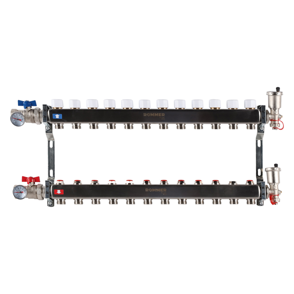 Коллекторный распределительный блок (гребенка) ROMMER предназначен для улучшения производительности систем отопления зданий, за счет равномерного распределения теплоносителя по контурам. Благодаря многофункциональности коллекторных блоков в отапливаемых помещениях создаются не только комфортные условия для пребывания людей, но и значительно увеличиваются сроки службы оборудования и систем теплоснабжения. Это также помогает избежать лишних затрат.Может использоваться как в домах индивидуальной застройки, так и в системах отопления многоквартирных жилых зданий, где требуется распределение потока теплоносителя между помещениями на этаже многоквартирного многоэтажного жилого или административного здания.