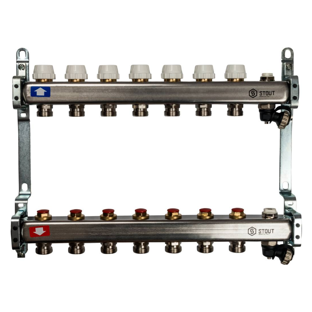 Коллектор из нерж. стали 7 выходов без расходомеров, с клапаном вып. воздуха и сливом / Stout