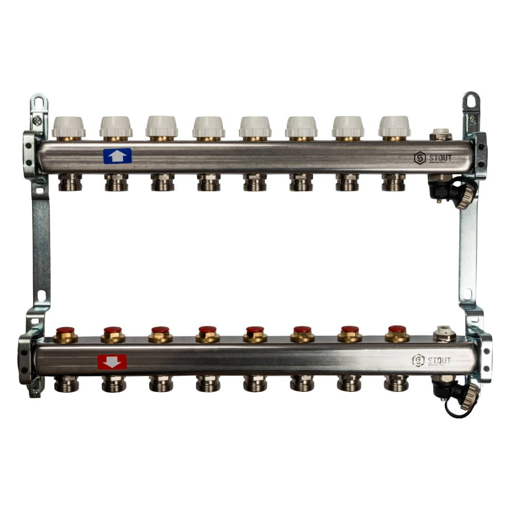 Коллектор из нерж. стали 8 выходов без расходомеров, с клапаном вып. воздуха и сливом / Stout