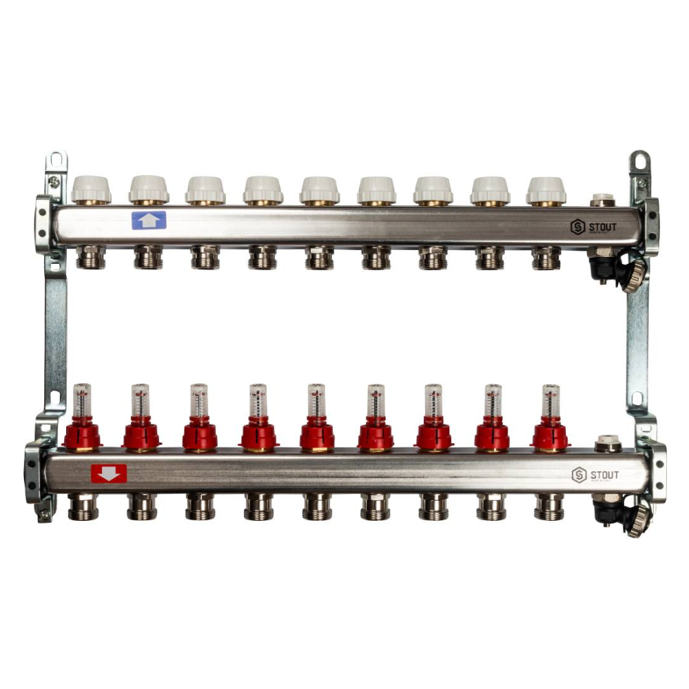 Коллектор из нерж. стали 9 выходов с расходомерами, с клапаном вып. воздуха и сливом / Stout