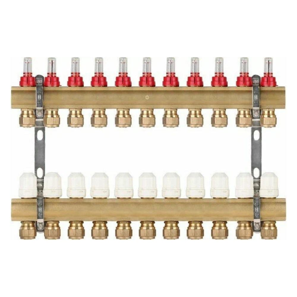 - в комплект поставки входят 2 коллектора (подача и обратка), крепление коллектора, расходомеры, регулировочные вентили и евроконус (адаптер) 16 (2.0)х3/4;