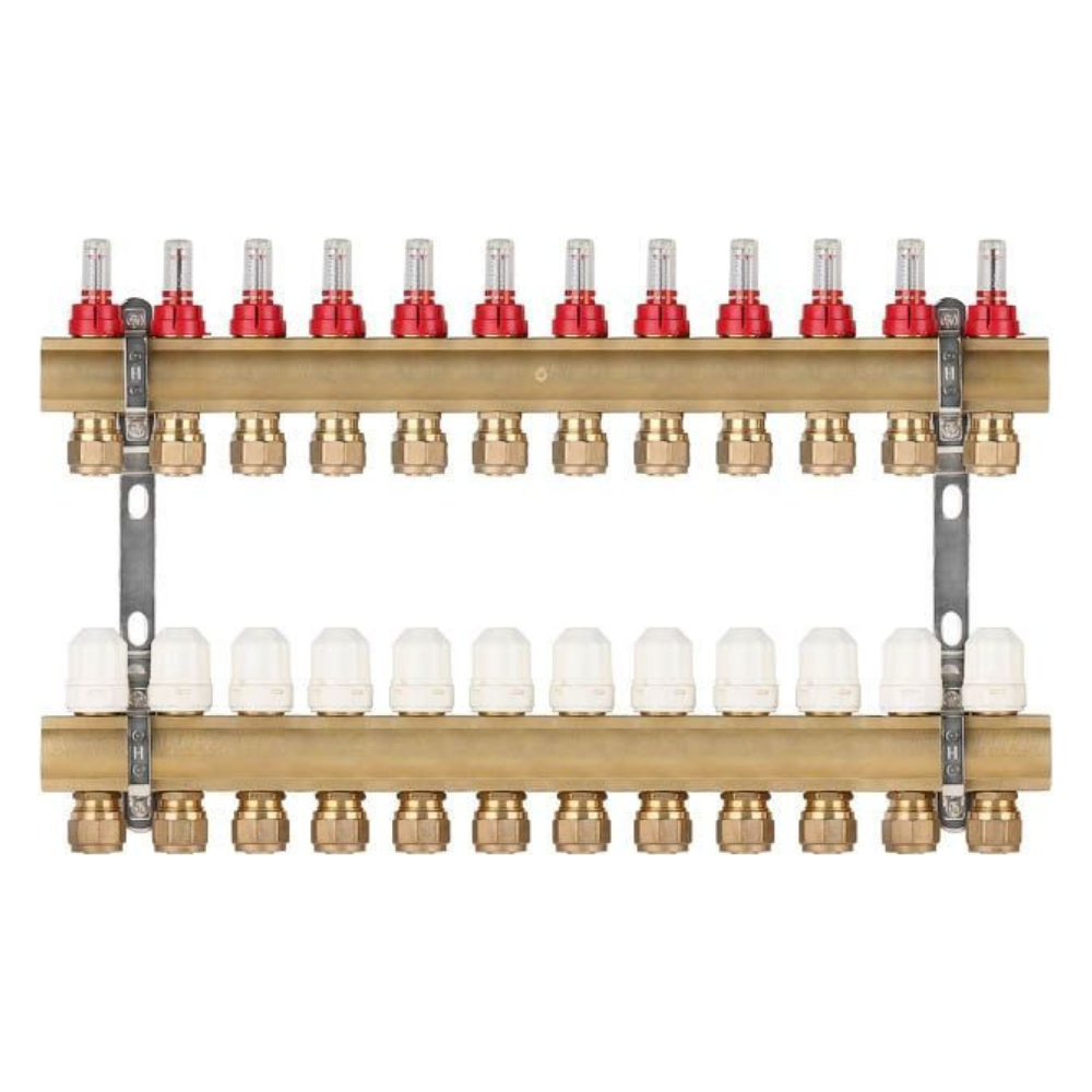 - в комплект поставки входят 2 коллектора (подача и обратка), крепление коллектора, расходомеры, регулировочные вентили и евроконус (адаптер) 16 (2.0)х3/4;