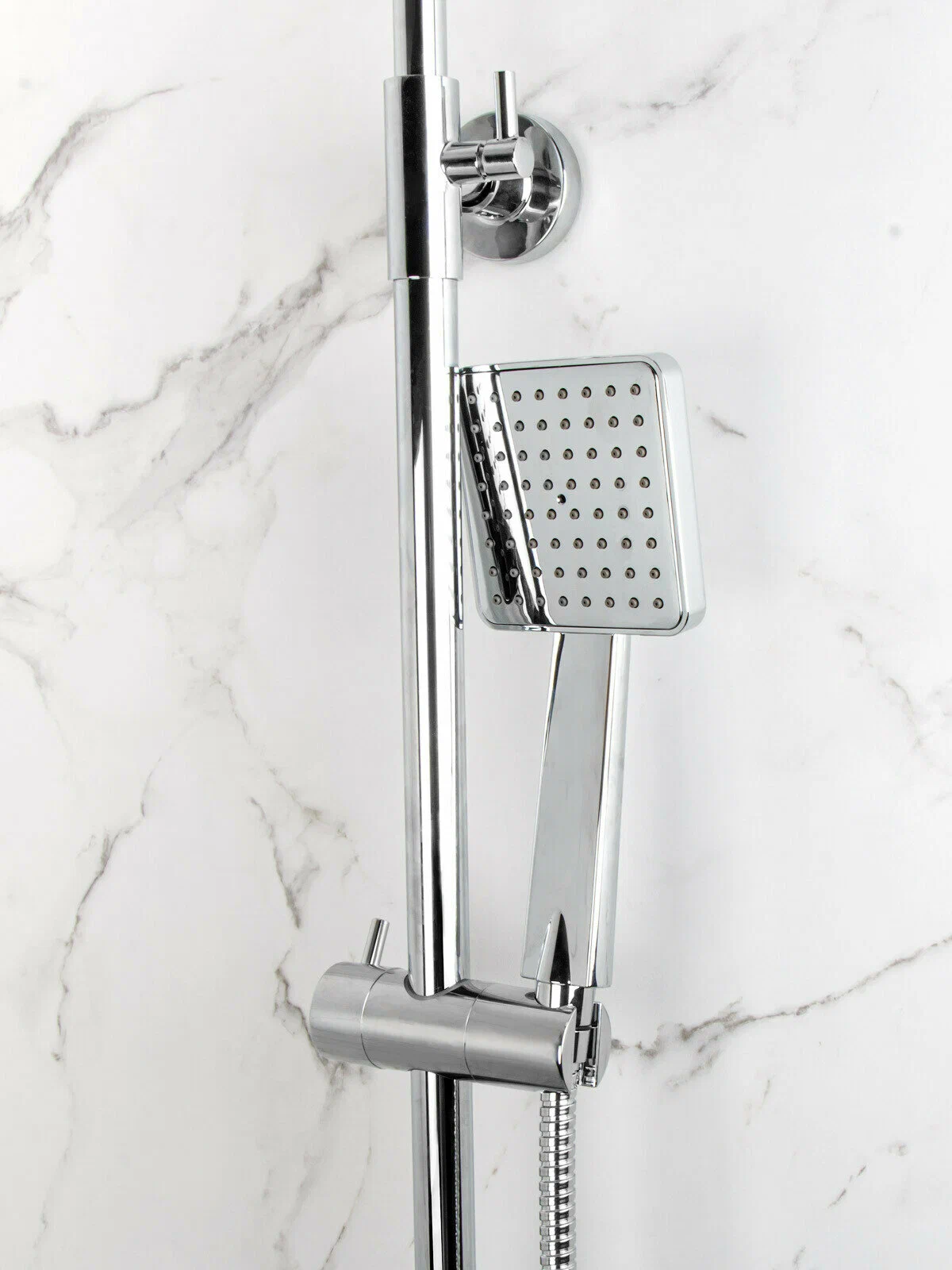 - верхний душ системы имеет квадратную форму и выполнен из пластика, что придает ему легкость и прочность. Ручной душ имеет один режим работы и выполнен из латуни;